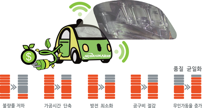 인공지능 자율 주행 컨셉의 NCBrain AICAM은 모델링만으로 안전하고 빠르게 무인 자동차 가공을 진행 합니다. 아이콘 5회 클릭 만으로 무인 운전은 물론