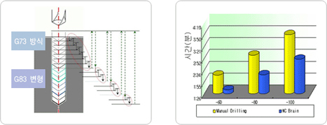 드릴 가공을 하다 보면 가공 시간 보다 칩 배출을 위한 시간이 훨신 많습니다. NCBrain은 고정 Cycle G73과 G83 변형 드릴 경의 3배 이상 되는 깊은 구간에서 G73 형태로
