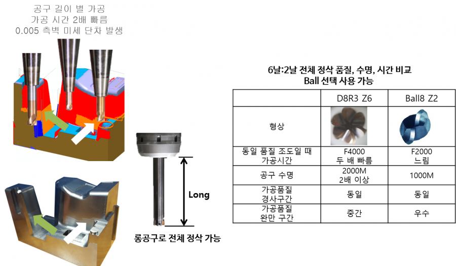 - 2천5백원 R커터 TIP으로 황잔삭과 중삭, 6날 정삭, 최적 공구 길이