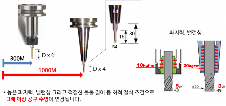 - 공구 직경의 4~5배 돌출로 긴 수명과 정밀도가 유지 됩니다.