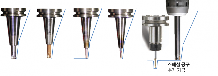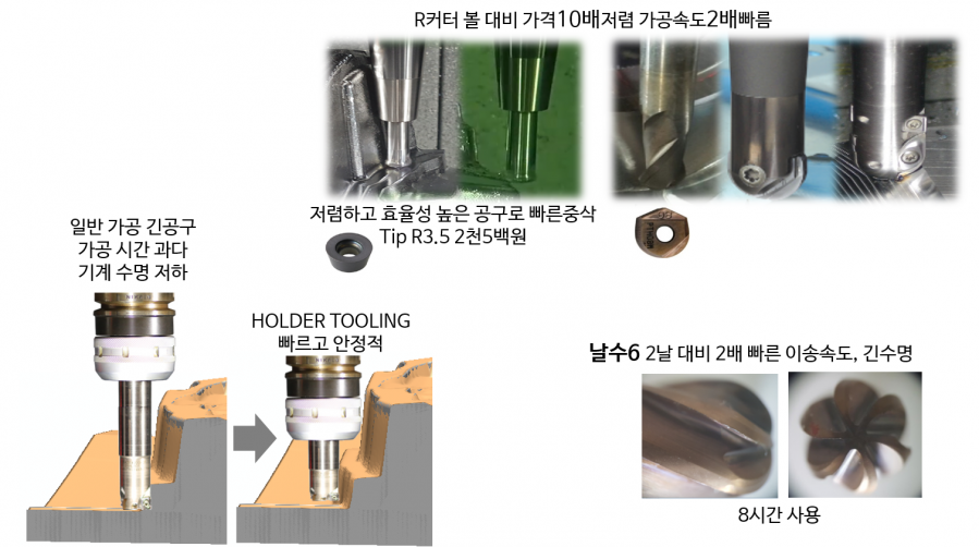 - 홀더 툴링으로 긴공구 황삭이나 과부하가 없어 기계 수명이 증대