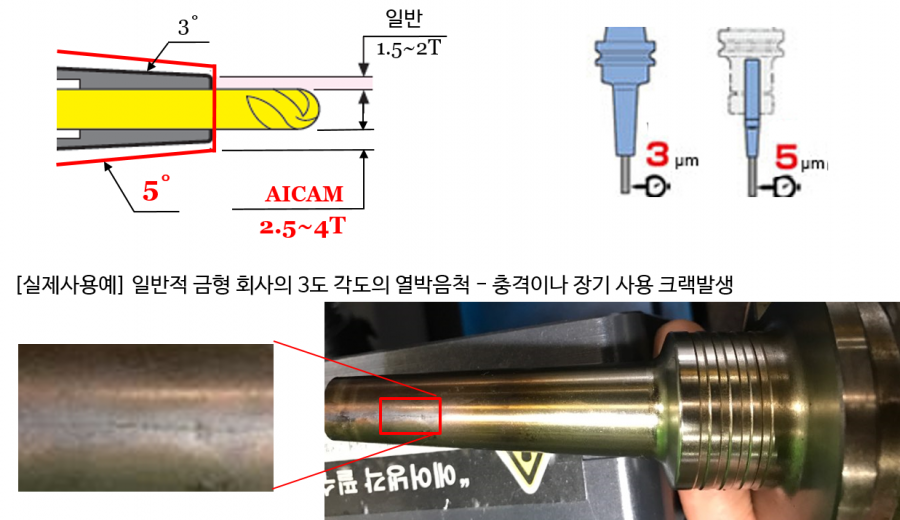 - 일반적 금형 회사 열박음척 3도 슬림 -> AICAM용 5도 2.5~4T로 강성 유지