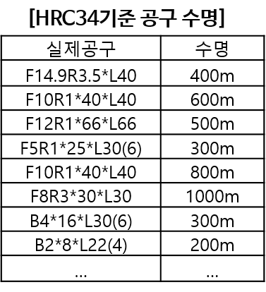 - HRC30 이하 일반 금형강(HP4)에서는 하단 표의 2배 가량의 수명이 유지 됩니다.