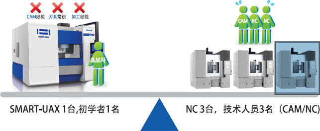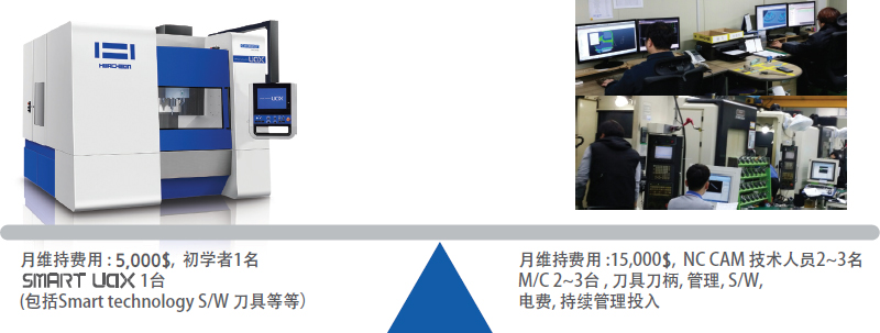 | 同等投入 | 1台(包括Smart technology S/W 刀具等等) | NC 2~3台.刀具,CAM等 |